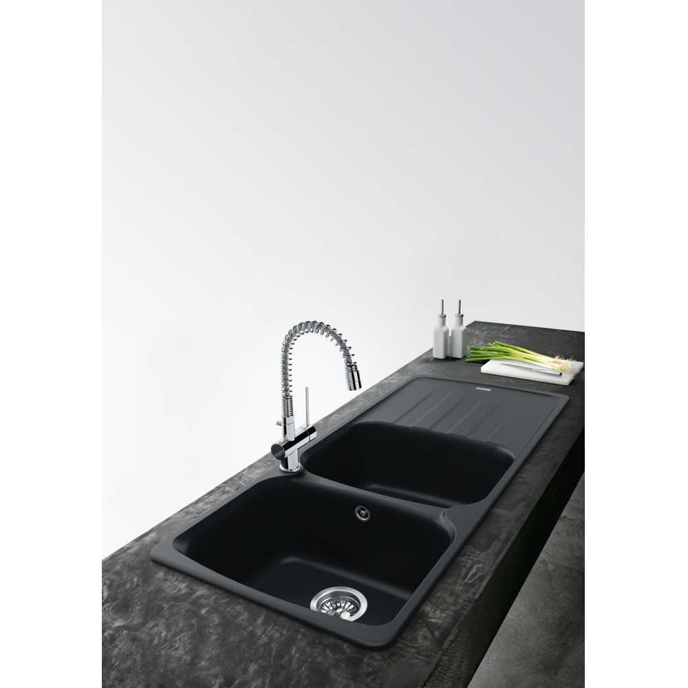 A double bowl inset Fragranite kitchen sink with reversible drainer and 50 Year Guarantee.