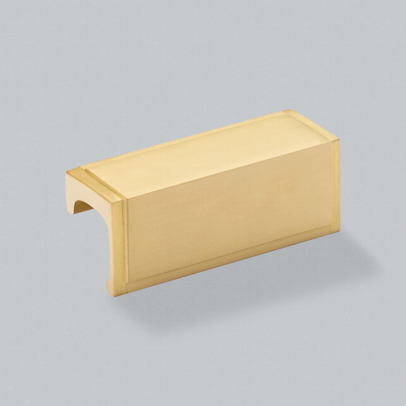 A sculptural brass cabinet pull handle with captivating stepped detailing and an ergonomic profile inspired by urban architecture. Its clean yet expressive design blends form and function, making it a refined choice for kitchen, bedroom and bathroom cabinetry.