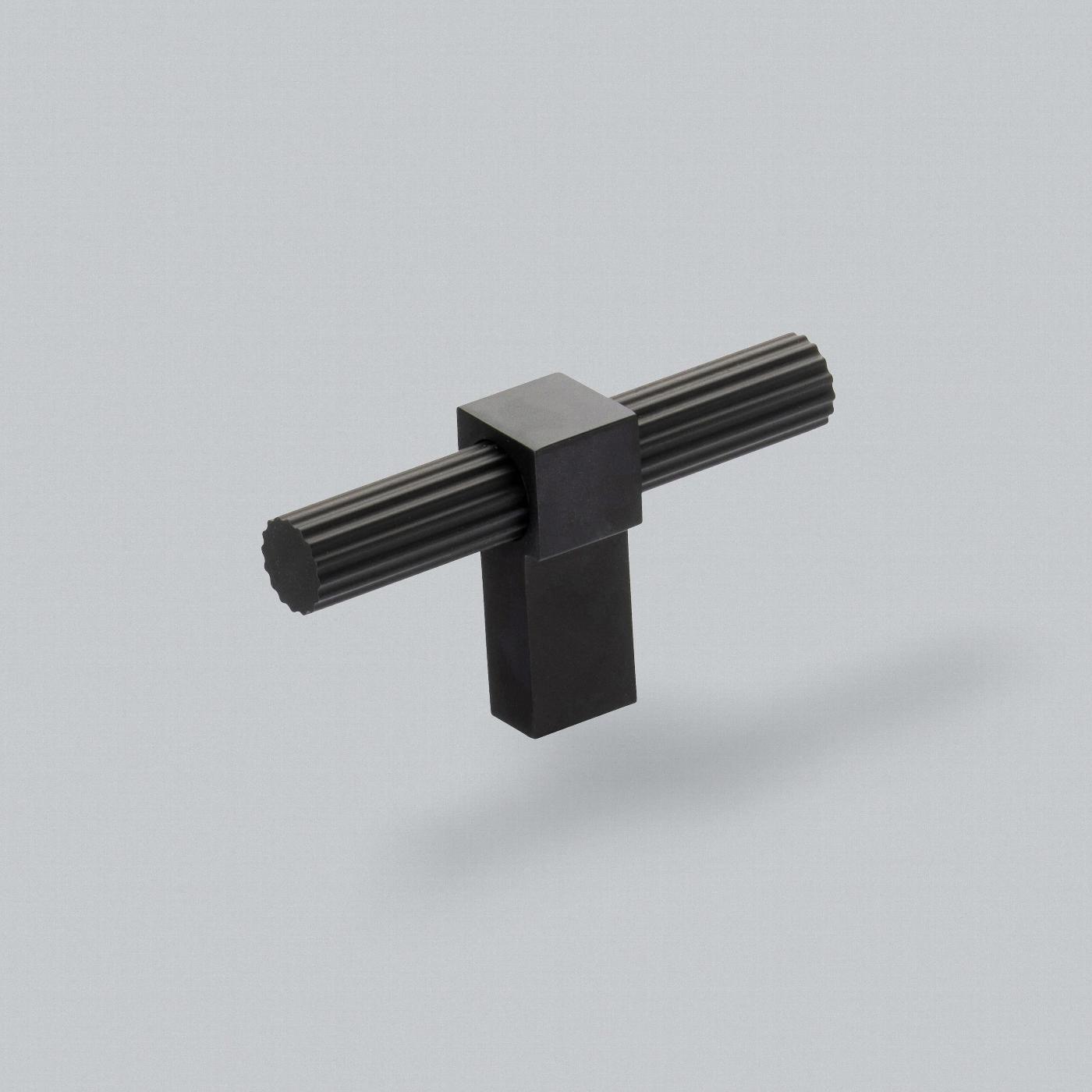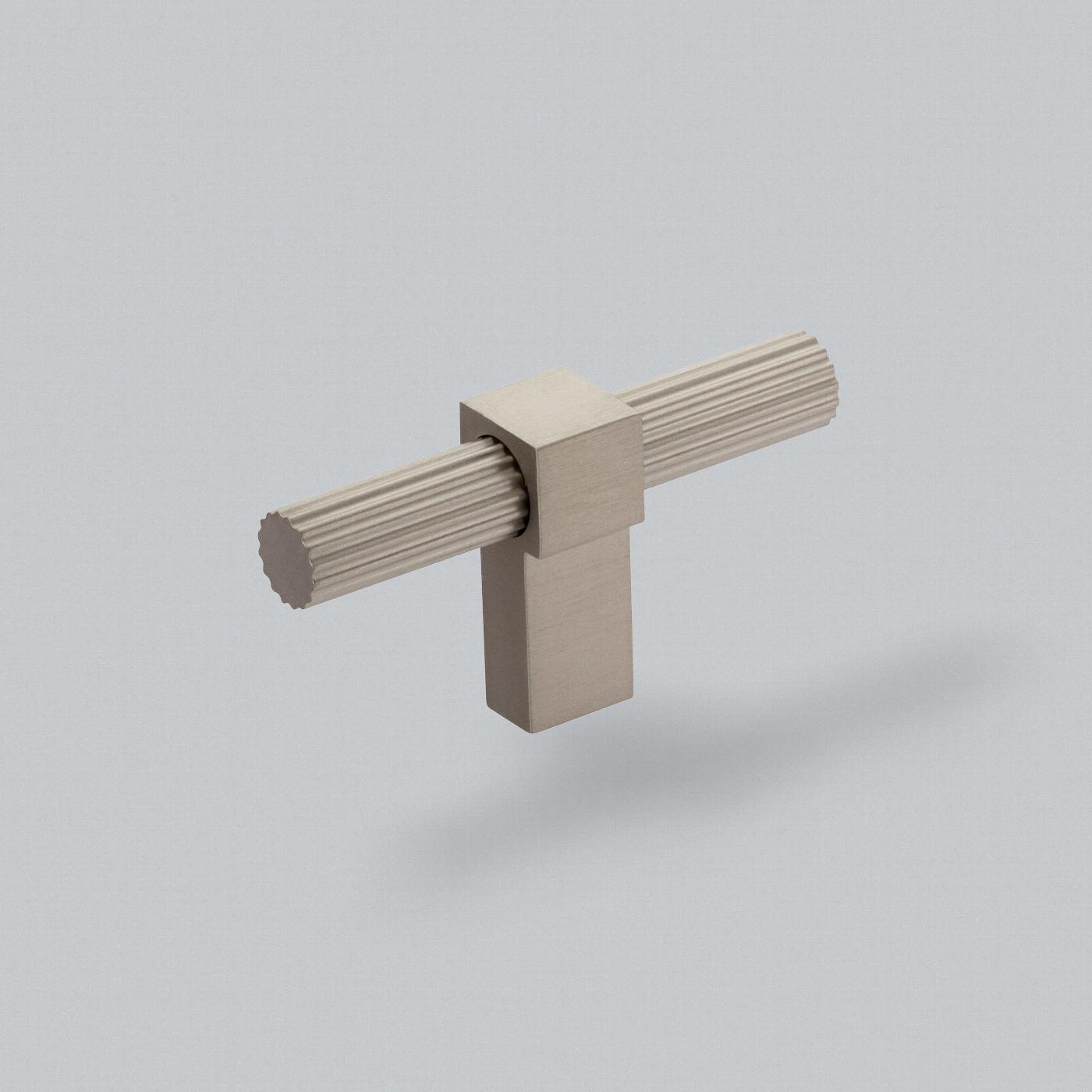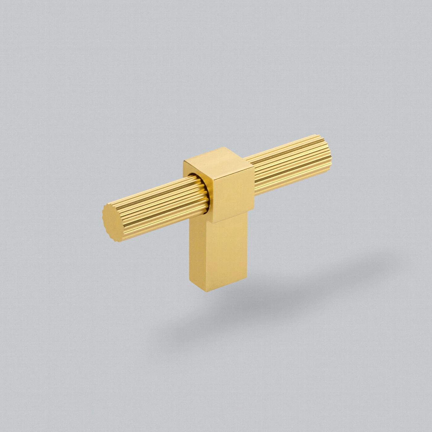 A contemporary T-bar cabinet knob featuring bold linear groove detailing along the bar, creating tactile interest and visual rhythm. Crafted from high-quality brass, it brings refined contemporary style and durable performance to kitchen, bedroom and bathroom cabinetry.