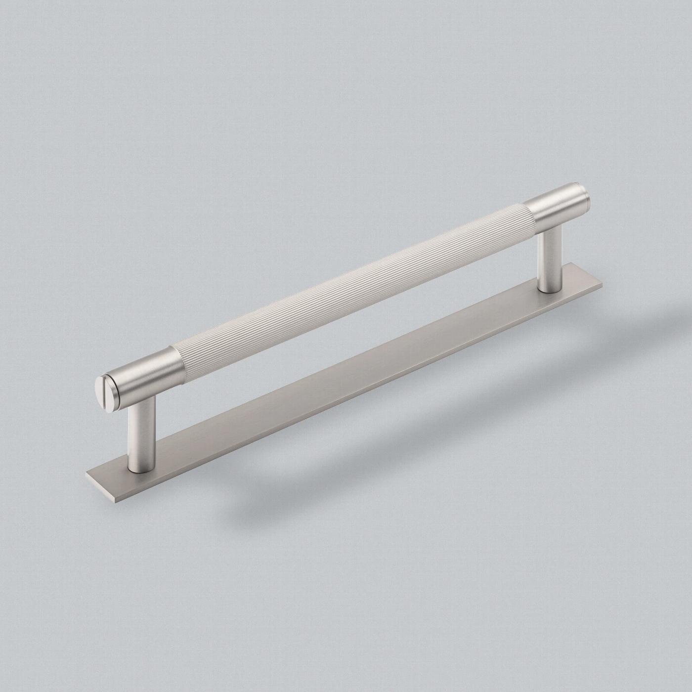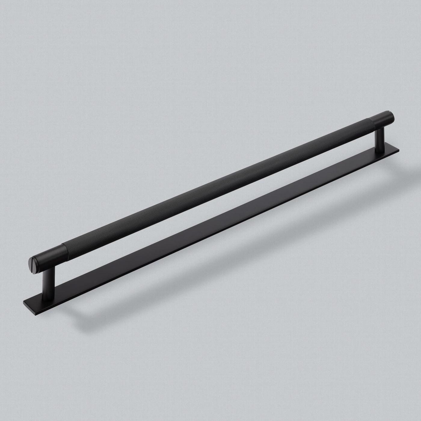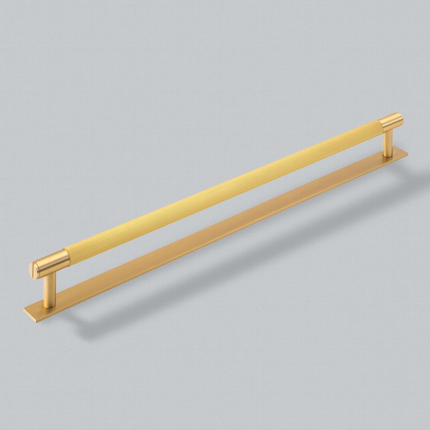 A bold industrial-inspired appliance pull handle featuring tactile linear knurl texture and screw-end detailing that adds architectural flair to kitchen cabinetry. Designed in solid brass for durable performance, it suits integrated appliance doors and tall kitchen units alike.