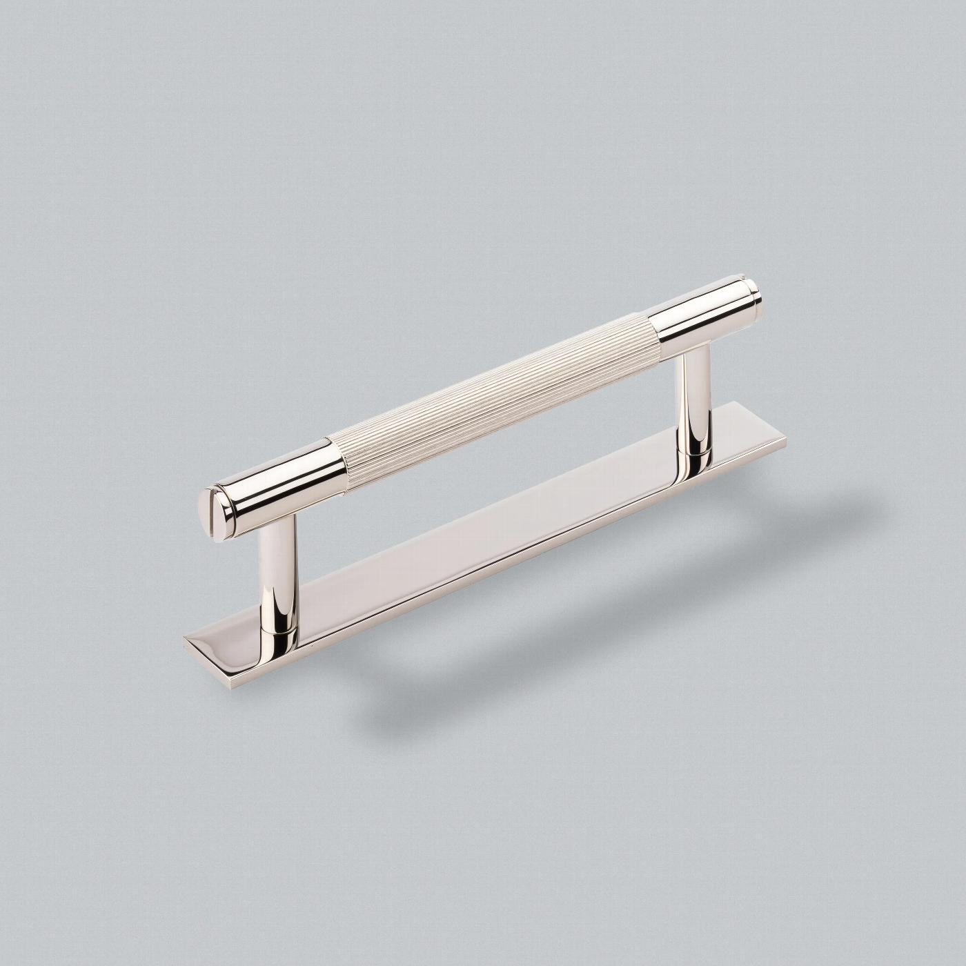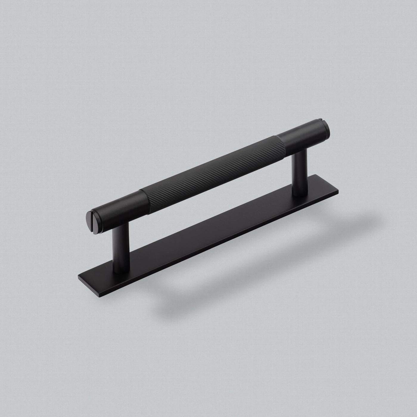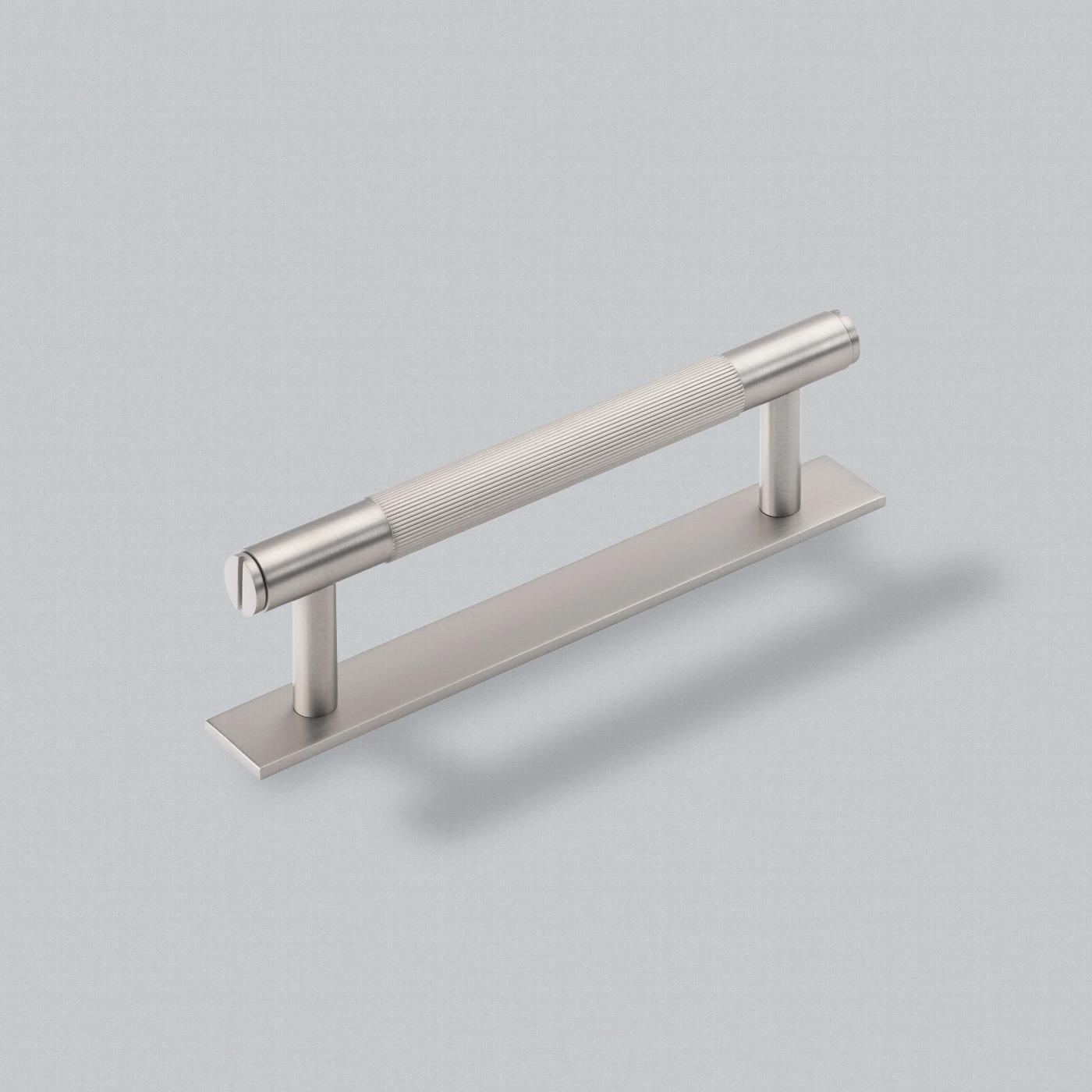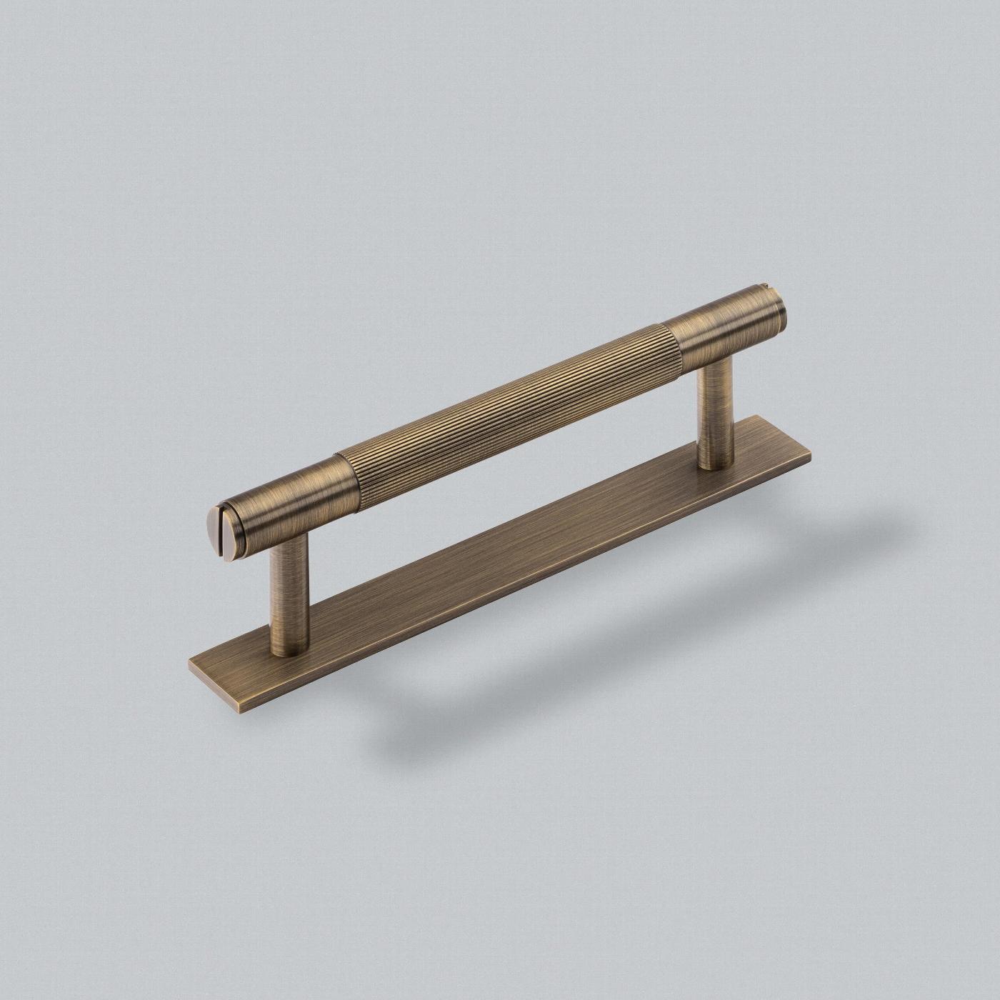 A bold industrial-inspired pull handle featuring distinct linear knurl detailing and machined screw-end accents that add architectural character and tactile grip. Crafted from solid brass, it brings a refined industrial aesthetic to kitchens, bedrooms and bathrooms.